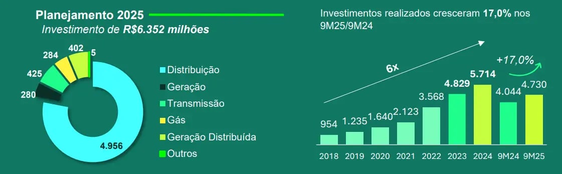 Além de já ter investido 6 vezes mais desde 2018, entre 2025 e 2029 estão planejados investimentos de R$39,2 bilhões, sendo R$6,4 bilhões em 2025, principalmente em seu principal segmento, distribuição de energia.