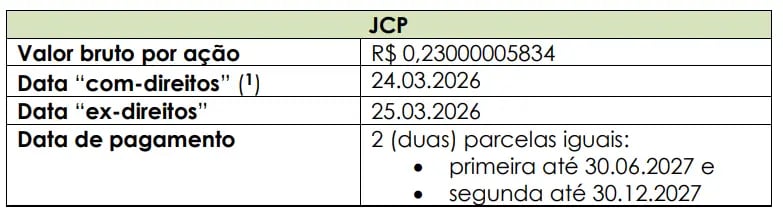 Além dos resultados, a Cemig anunciou um montante de R$ 658 milhões em JCP, equivalentes a R$ 0,23 por ação. A data-com e as datas de pagamento seguirão a tabela abaixo.