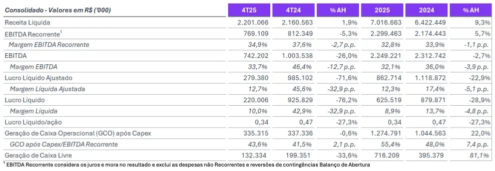 A receita líquida da Cogna atingiu R$ 2,2 bilhões no 4T25, leve alta de +2%. Já o Ebitda recorrente totalizou R$ 769 milhões, o que representa uma queda de -5%.