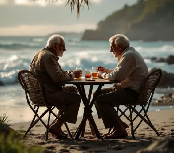 Agora olhe a imagem abaixo. Tente imaginar o que duas pessoas aposentadas e bem-sucedidas estão conversando. Vão falar sobre vida, filhos, netos, viagens, bebidas, comida e, talvez, investimentos. Mas algo que eu não consigo imaginar é que eles estejam tentando comparar a rentabilidade da carteira ao longo dos últimos 50 anos.
