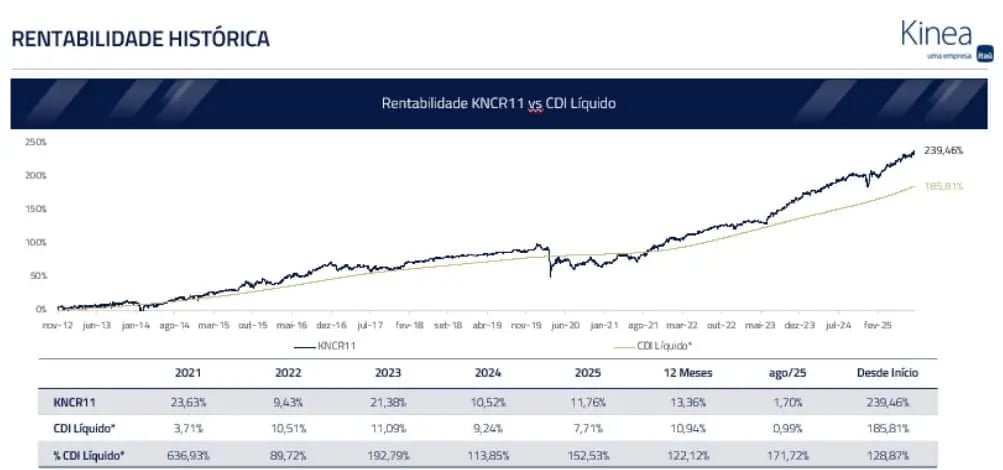 Um bom exemplo é o KNCR11, da Kinea. Ele possui uma taxa média de CDI+2,16% a.a., livre de impostos sobre o rendimento (o que faz toda a diferença!). Isso fez com que o fundo entregasse, em média, um retorno de 128% do CDI líquido de impostos (à alíquota de 15% na fonte).