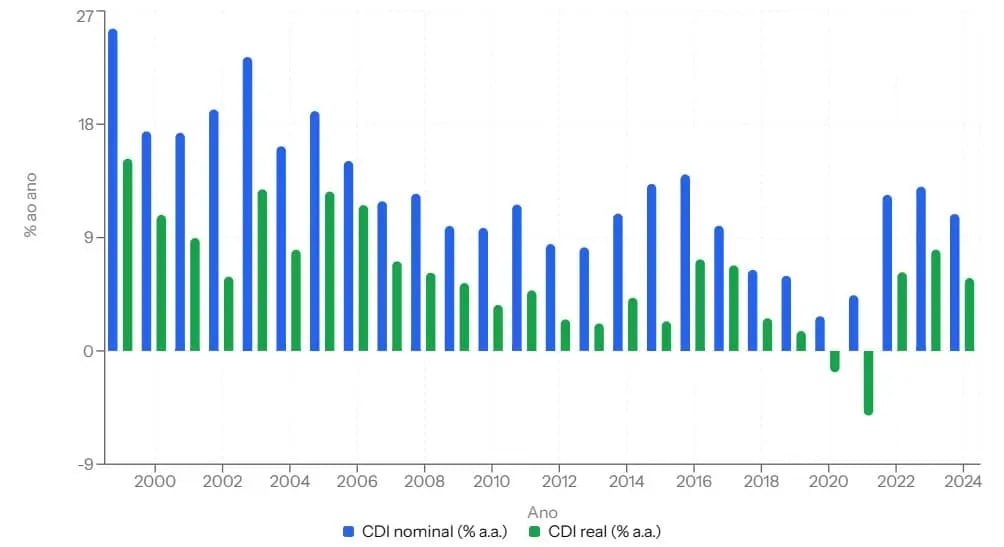 No Brasil pós-Plano Real, o CDI teve uma performance invejável: nos 30 anos do Plano Real (julho de 1994 a junho de 2024), o CDI acumulou um retorno de aproximadamente 5.688,9%, com uma média de cerca de 17% ao ano. Esse retorno foi mais do que o dobro da poupança e o triplo do Ibovespa no mesmo período. Um retorno excelente!