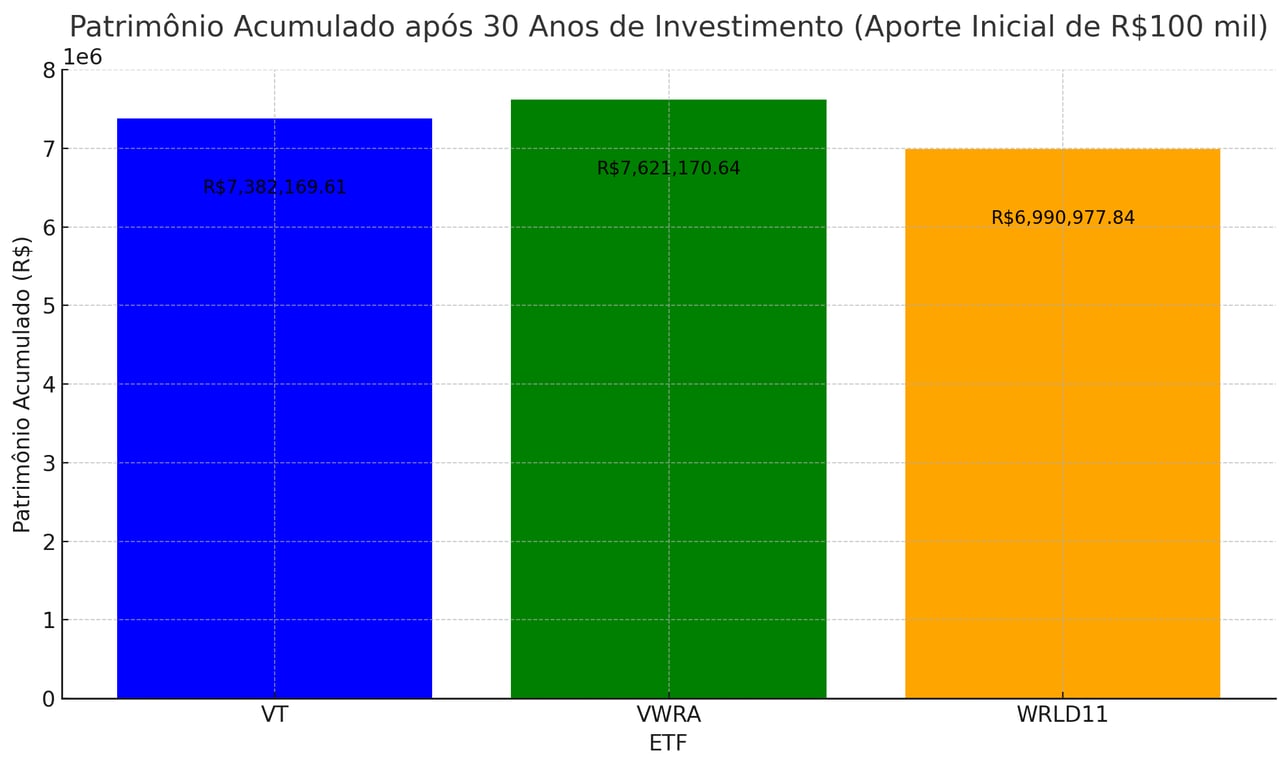 O VT (Vanguard Total World Stock ETF), VWRA (Vanguard FTSE All-World ETF) e o WRLD11 (Investo FTSE Global Equities ETF). Consideramos um investimento inicial de R$ 100 mil, aportes mensais de R$ 5 mil e um custo de remessa (Spread + IOF) de 1%.