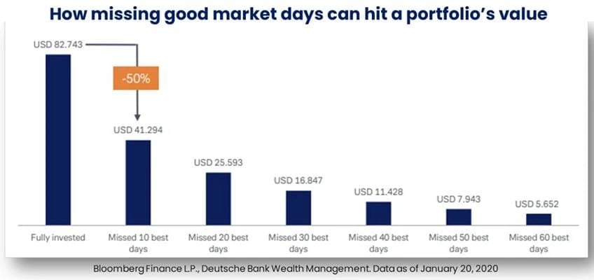 O gráfico abaixo, do Deutsche Bank Wealth Management, traduz essa ideia de forma prática: um investidor que permaneceu 100% alocado no S&P 500 teve retorno acumulado de cerca de US$ 82,7 mil.