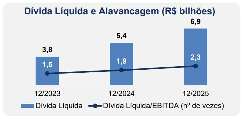 A posição financeira segue piorando. A dívida líquida alcançou R$ 6,87 bilhões (ante R$5,37 bilhões no mesmo período do ano passado), e o índice de alavancagem (dívida líquida/Ebitda) foi de 2,3x, que apesar de estar dentro de patamares confortáveis, subiu de 1,9x no 4T24.