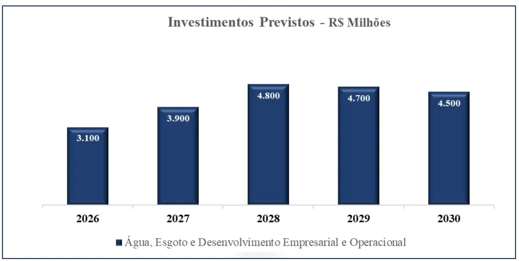 Esse fato é devido ao Programa Plurianual de Investimentos para o período de 2026 a 2030, que visa, principalmente, à ampliação dos sistemas de abastecimento de água e esgotamento sanitário, extensão de redes, segurança hídrica e combate a perdas.
