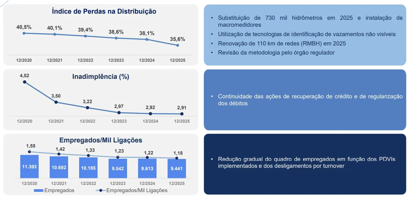O índice de perdas (volume de água distribuída/volume medido) foi de 35,6% (-2,5 p.p.), enquanto o índice de inadimplência permaneceu praticamente estável em 2,9%. Já o índice de “empregados por mil ligações” passou de 1,22 no mesmo período do ano anterior para 1,18 no 4T25.