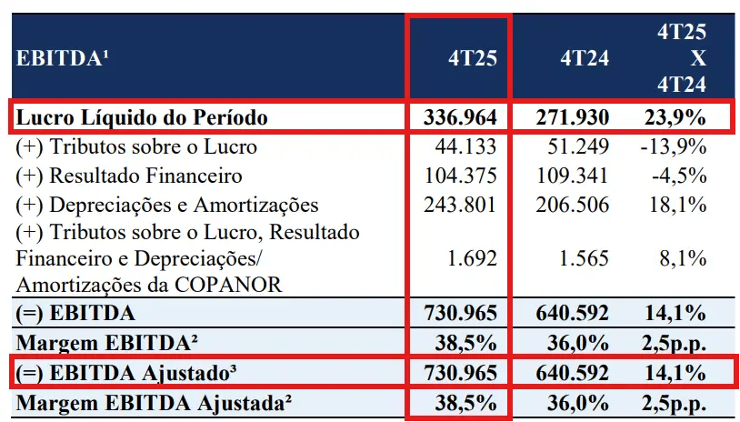 A Copasa (CSMG3) apresentou resultados neutros no quarto trimestre de 2025. A receita líquida foi de R$ 1,88 bilhão no período, crescimento de +7%, impulsionada principalmente pelo reajuste tarifário médio aplicado em janeiro de 2025 e crescimento de volume de água e esgoto.