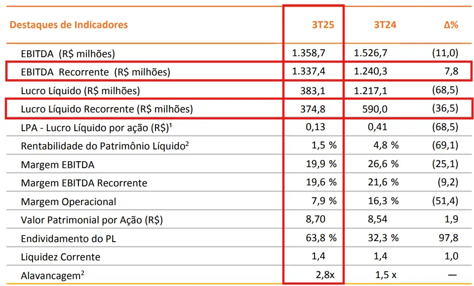 Assim, o Ebitda recorrente totalizou R$ 1,3 bilhão, alta de +8%, com margem Ebitda de 19,6% (-9,2 p.p.). Enquanto o lucro líquido da Copel, impactado por um resultado financeiro (negativo) +99% mais alto, registrou queda de -37%, totalizando R$ 375 milhões no trimestre.