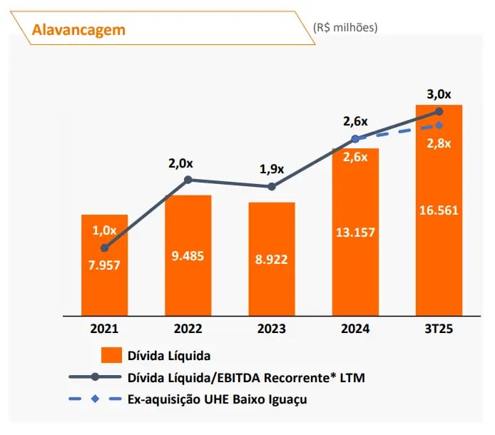 Por fim, a Copel encerrou o trimestre com dívida bruta consolidada de R$ 21 bilhões e um caixa de R$ 4,5 bilhões, resultando em uma dívida líquida de R$ 16,5 bilhões. Com isso, o indicador de alavancagem (dívida líquida/Ebitda) ficou em 3,0x (vs. 2,6x em 2024).