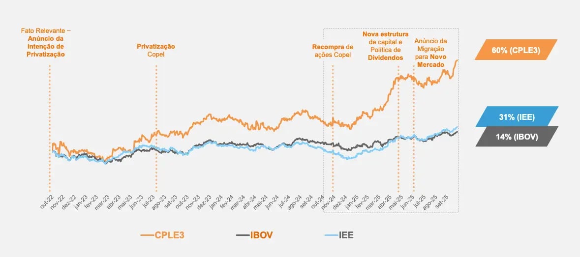 Desde o anúncio de intenção de privatização, no final de 2022, as ações da Copel já acumulam alta de cerca de +60%, enquanto o Ibovespa rendeu +14% e o Índice de Energia (IEE), +31%.