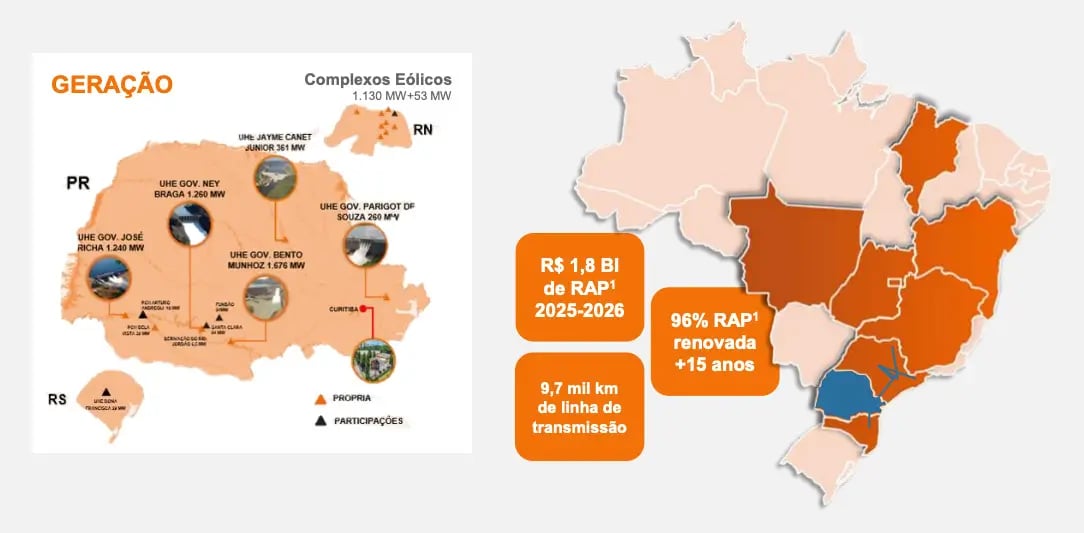 Em transmissão, são quase 10 mil quilômetros de linhas (e presença em outros sete estados além do PR), enquanto, em distribuição, a empresa distribui energia elétrica diretamente a mais de 5 milhões de unidades consumidoras, em cerca de 395 municípios do Paraná.