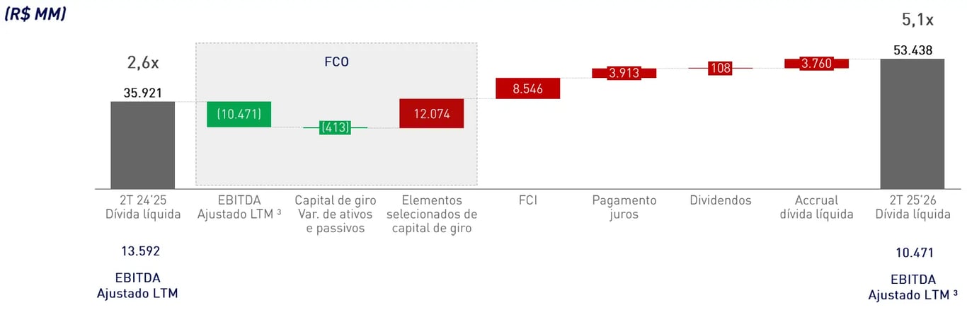 A estrutura de capital continua delicada, com uma dívida líquida de R$ 53,4 bilhões (+9% t/t), e a alavancagem encerrou o período em elevados 5,1x Ebitda (vs. 4,5x do trimestre anterior).