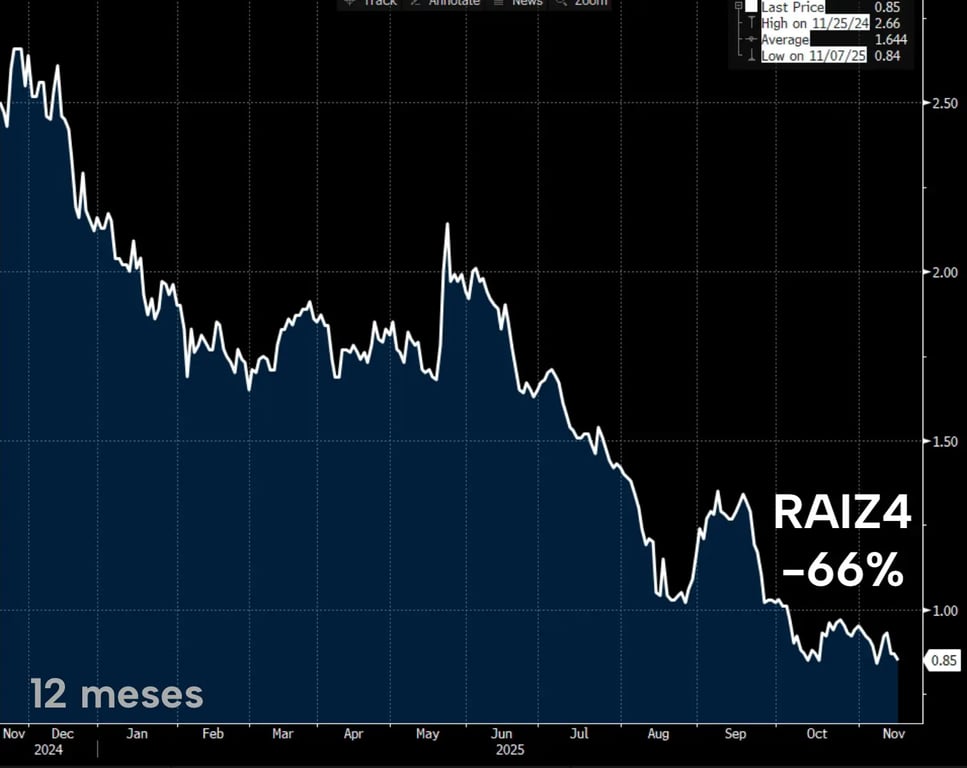 Esse cenário reflete na precificação dos papéis de RAIZ4, que registram uma desvalorização próxima de -70% nos últimos 12 meses.