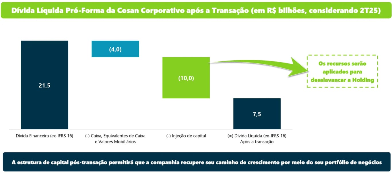 Com esse recurso, a Cosan reduz sua dívida líquida em -56%, caindo de R$ 18 bilhões para R$ 7,7 bilhões.