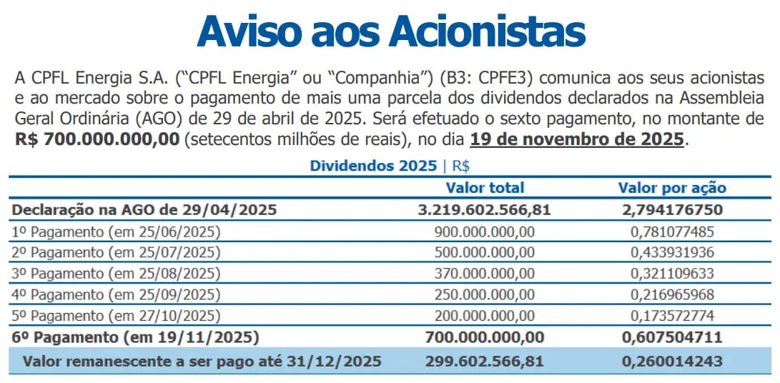 A sexta parcela da distribuição de dividendos de 2025 será paga no dia 19 de novembro. A parcela, de R$ 700 milhões, representa um dividendo de R$ 0,61 por ação (dividend yield de 1,3%). O restante (cerca de R$ 300 milhões) será pago ao longo do ano, representando R$ 0,26 por ação.