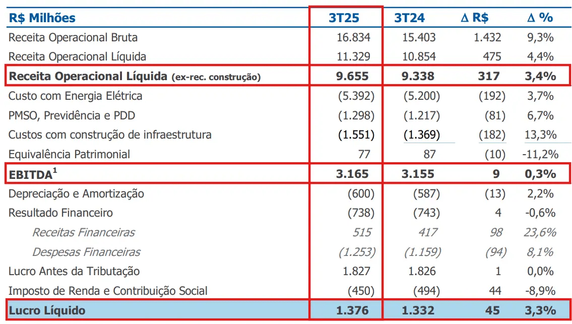 A CPFL (CPFE3) registrou uma receita líquida de R$ 9,7 bilhões no 3T25, alta de +3,4% em relação ao mesmo período do ano passado. Já o Ebitda totalizou R$ 3,2 bilhões, se mantendo praticamente estável, enquanto o lucro líquido foi de R$ 1,4 bilhão no trimestre (+3%).