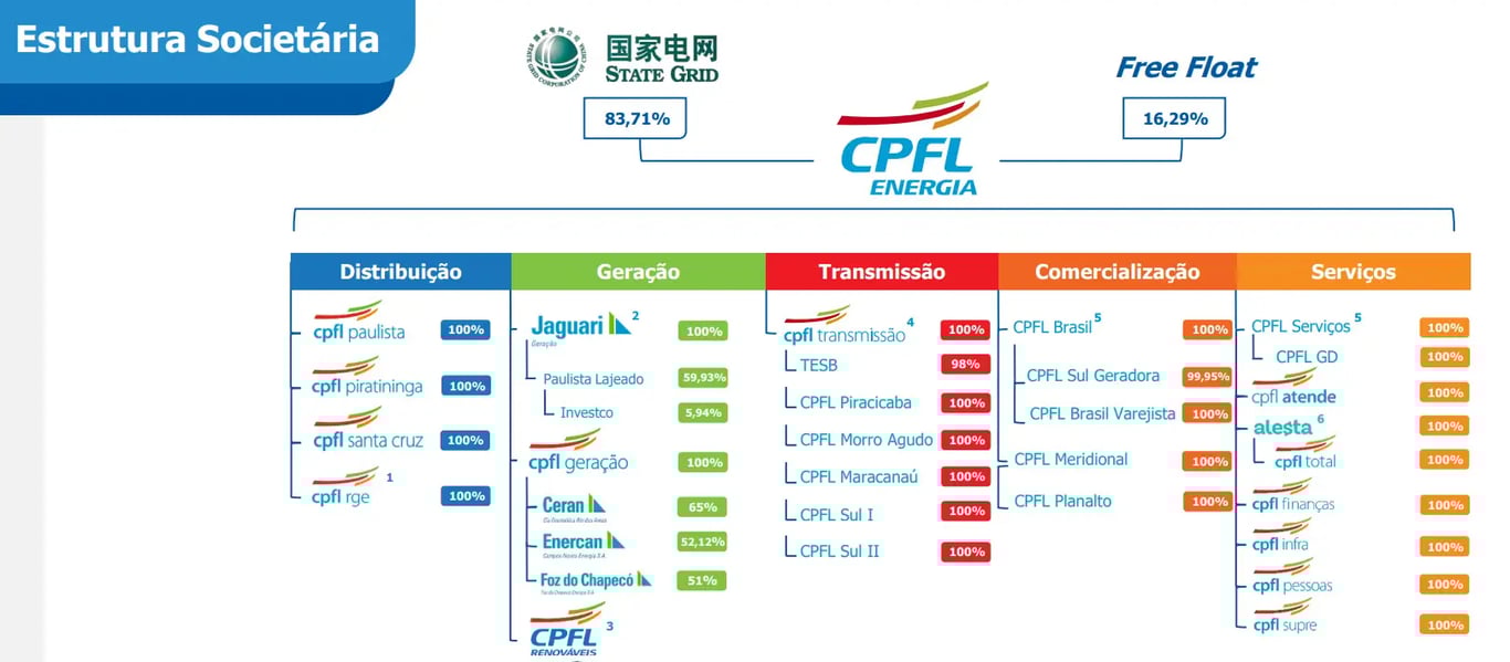 A companhia é controlada pela maior empresa de energia do mundo, a State Grid, estatal chinesa especializada em investimento, construção e operação de redes elétricas, fornecendo energia para mais de 1,1 bilhão de pessoas (88% do território chinês). Ainda que estatal, ela possui elevados níveis de governança e o mesmo rating soberano da China.