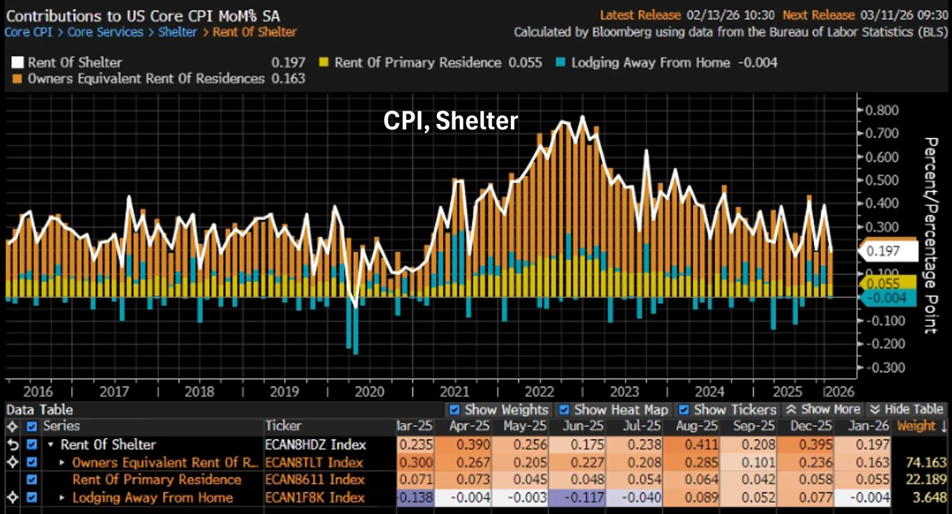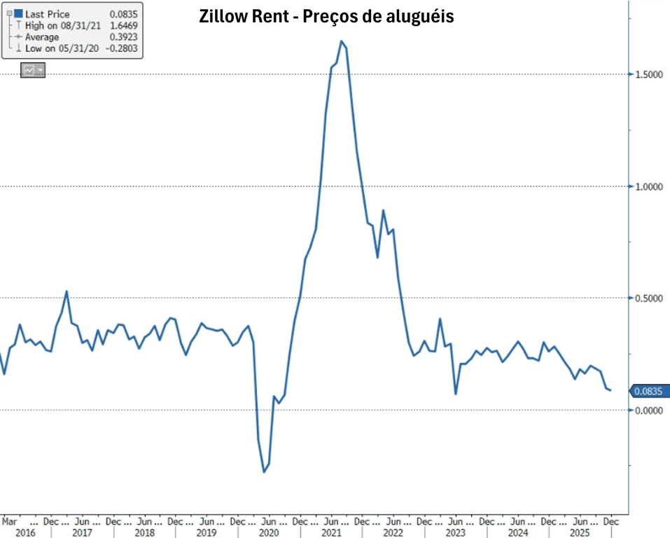 A inflação de Shelter desacelerou de +0,40% para +0,20%, o menor número desde junho de 2025 (+0,18%) e mais em linha com a desaceleração que temos observado nos preços dos aluguéis na ponta.