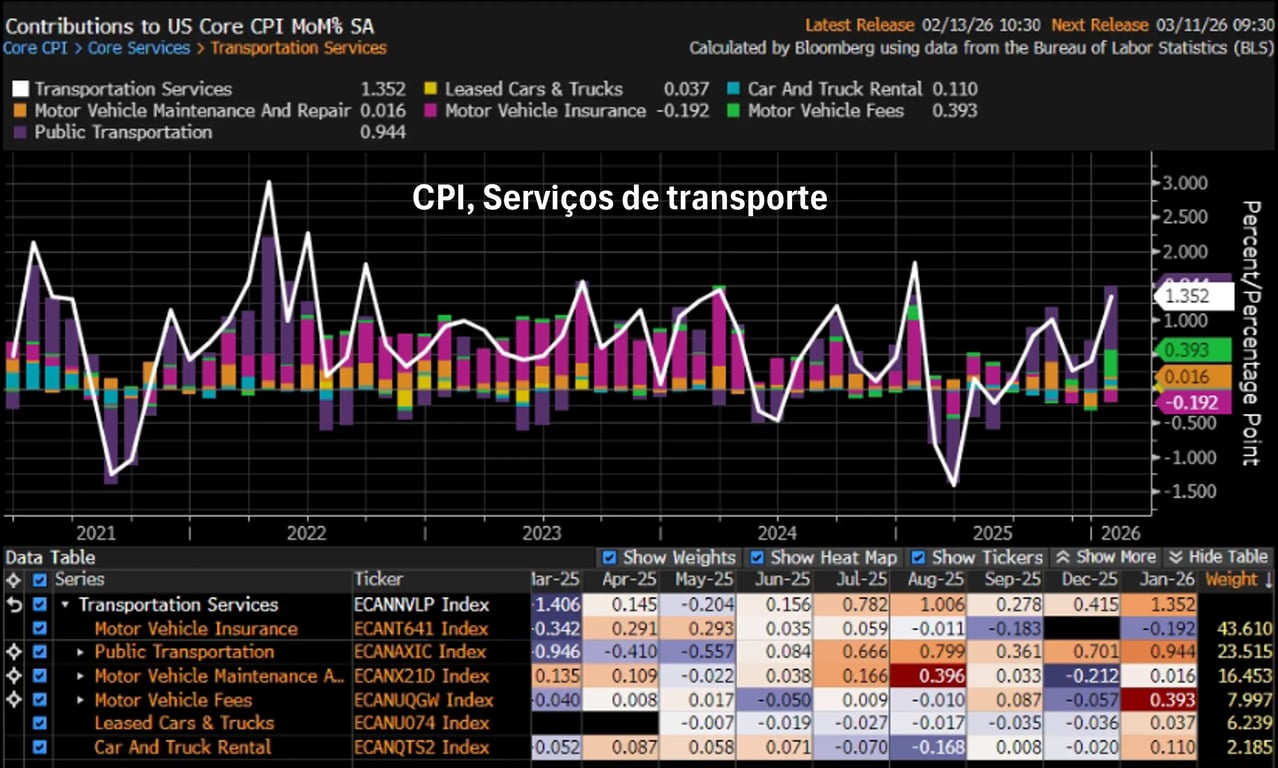 Apesar dessa pressão em serviços, a inflação de Shelter (aluguel e serviços habitacionais), categoria que possui o maior peso no cálculo de serviços e tem maior inércia, voltou a desacelerar após a pressão mostrada em dezembro.