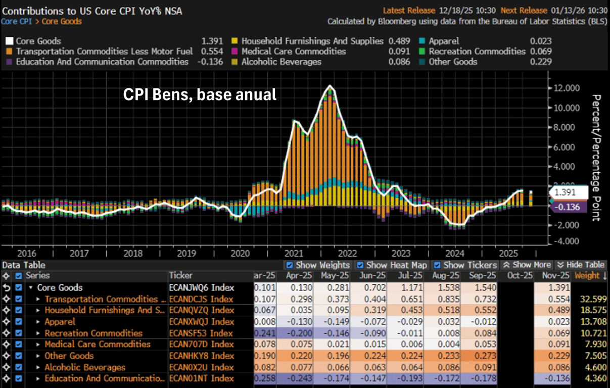 O setor de bens desacelerou de +1,54% para +1,39% (na base anual), patamares ainda mais altos do que observávamos nos últimos trimestres, devido aos efeitos das tarifas de importação.