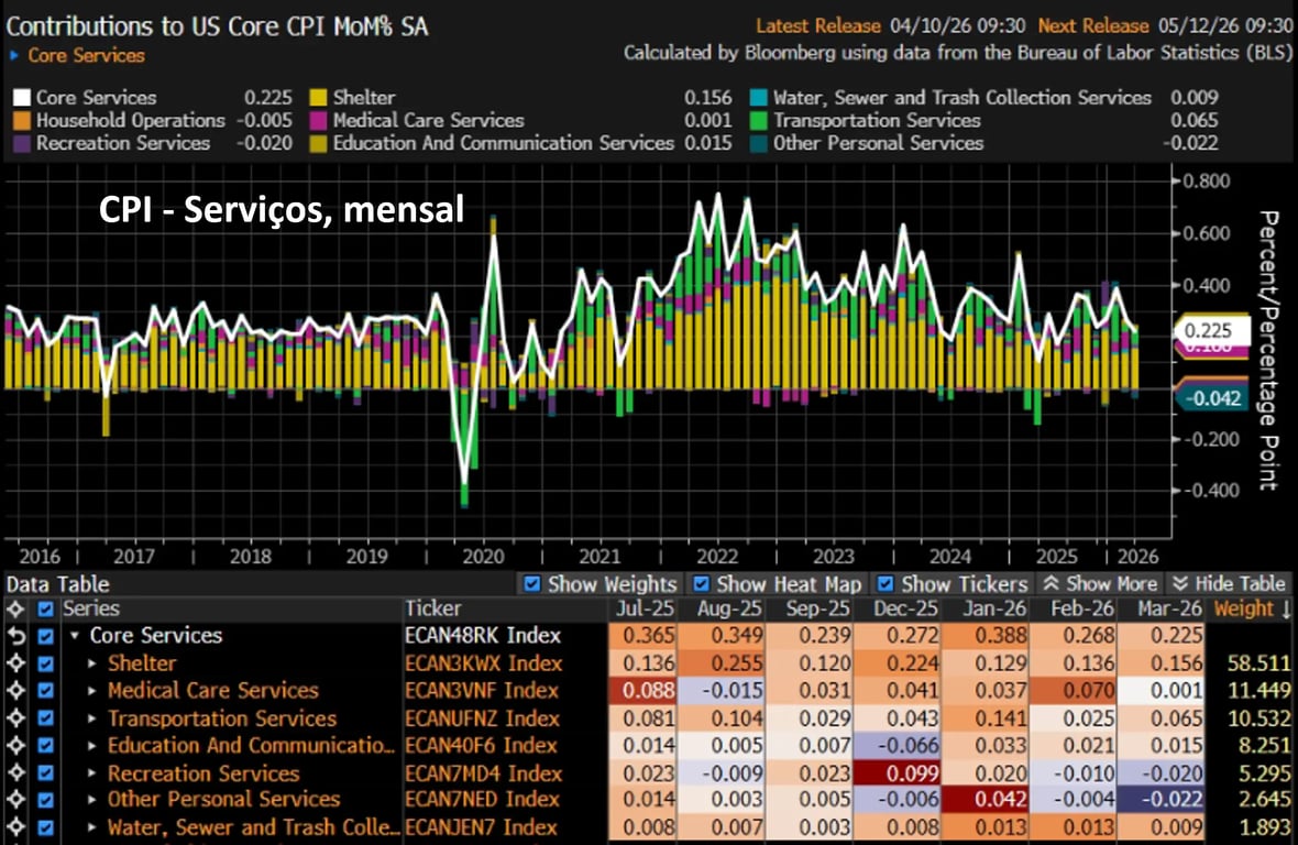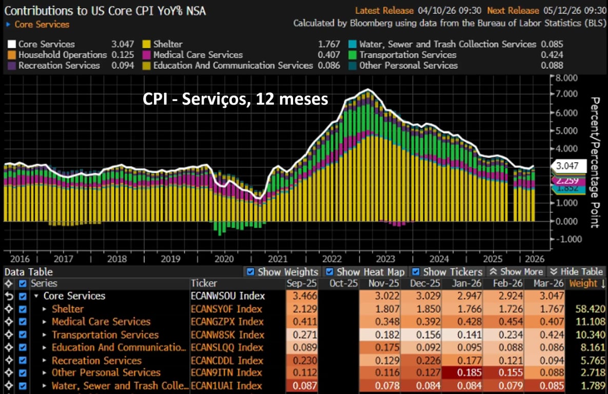 Serviços ainda acumulam alta de +3,05% em 12 meses e precisam reduzir esse patamar para que a inflação caminhe em direção à meta do Fed de 2%. Contudo, temos visto um processo de desaceleração em curso, e o dado já é melhor do que os +3,68% observados em março de 2025.