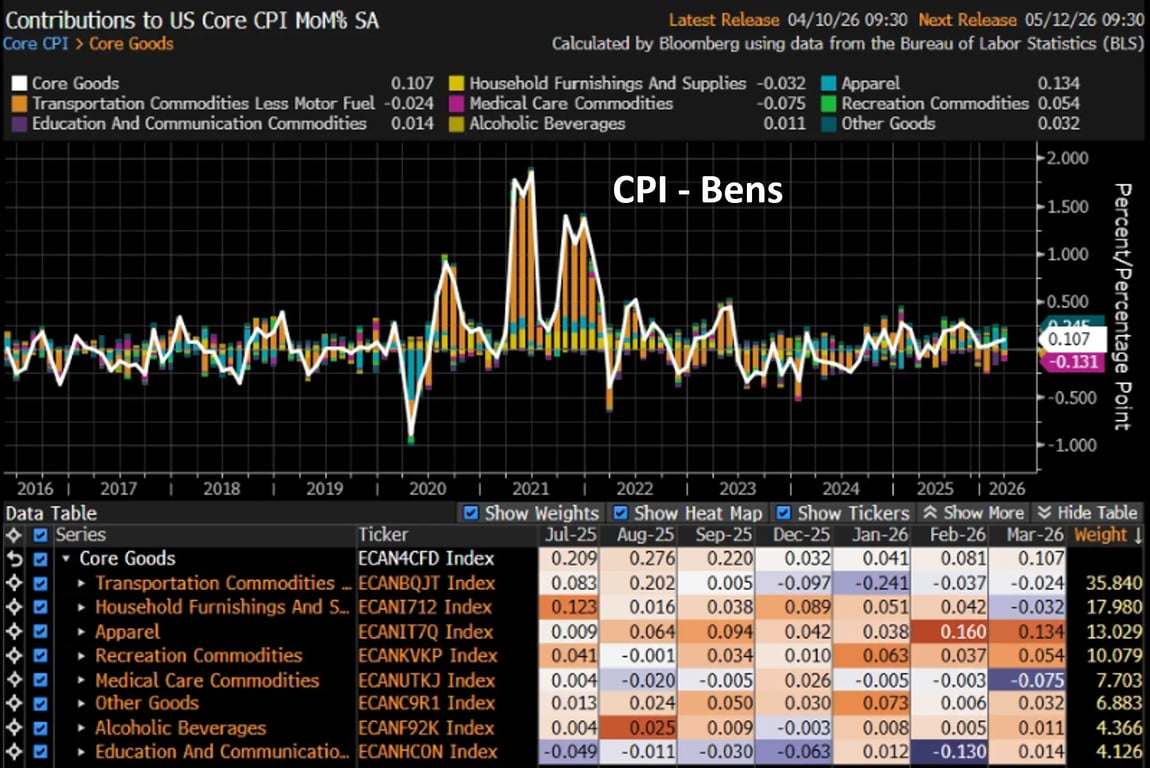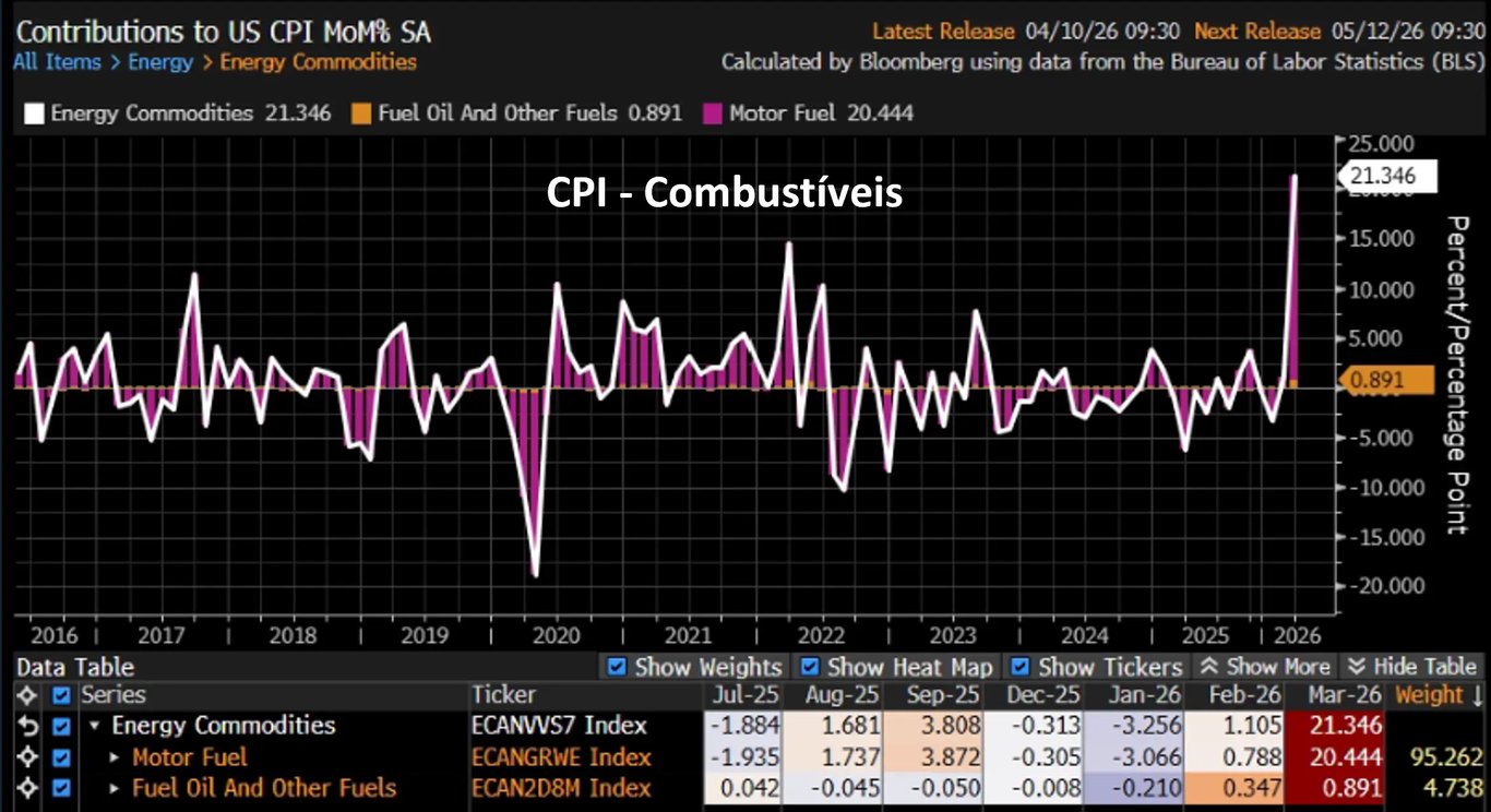 O CPI veio significativamente mais forte do que o núcleo em razão da pressão dos preços dos combustíveis, que passaram de +1,11% para +21,34%, devido à pressão do petróleo decorrente da escalada dos conflitos no Oriente Médio ao longo do mês.