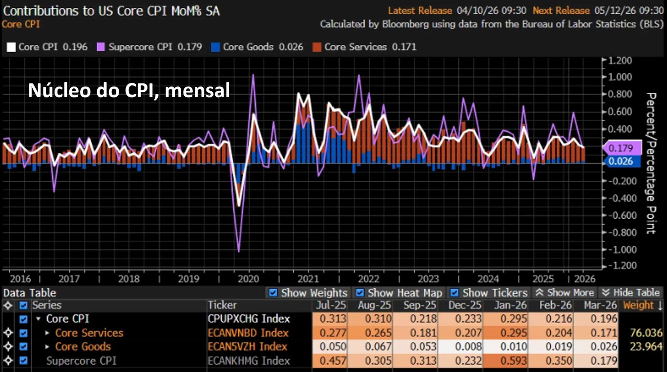 O núcleo do CPI, leitura mais importante por excluir itens mais voláteis, como alimentos e energia, foi de +0,20% em março, abaixo das expectativas de +0,30%. No acumulado em 12 meses, o núcleo está em +2,59%.