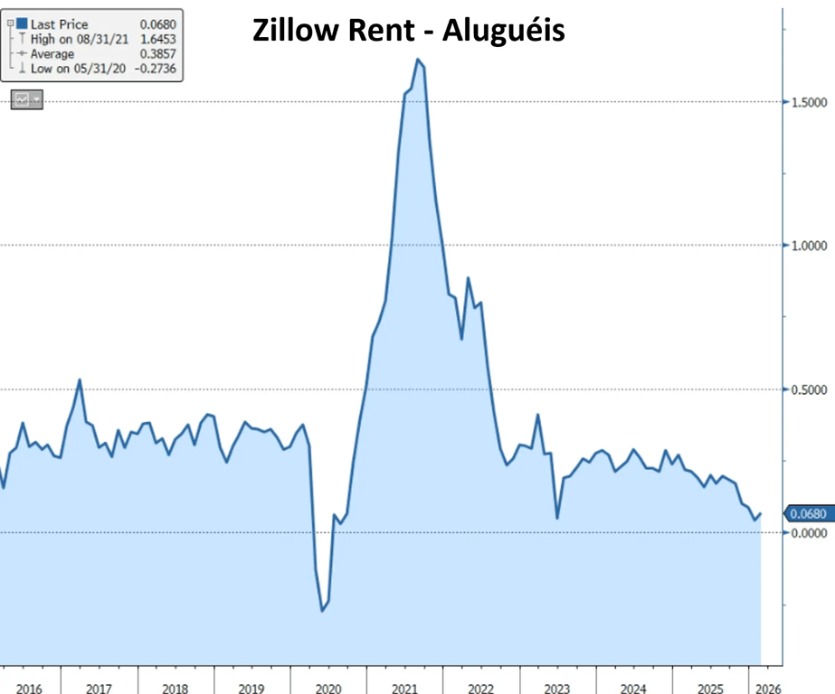 O cálculo de Shelter embute certa defasagem, enquanto os dados de Zillow Rent capturam melhor a dinâmica dos preços de aluguéis na ponta.