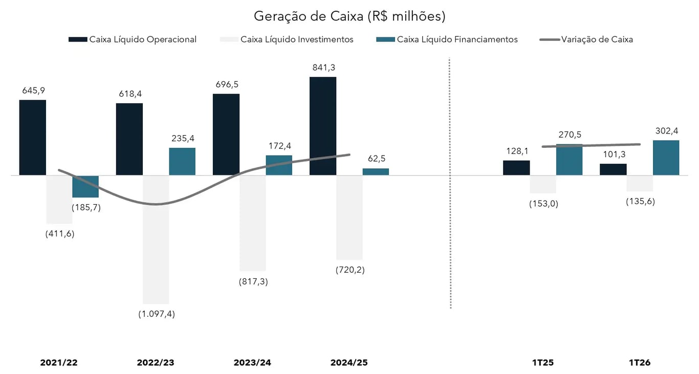 No 1T26, houve geração operacional de R$ 101 milhões líquidos, mesmo diante do prejuízo contábil, sustentado por forte depreciação e maior caixa gerado pelas atividades operacionais.