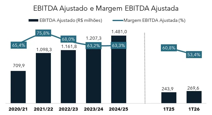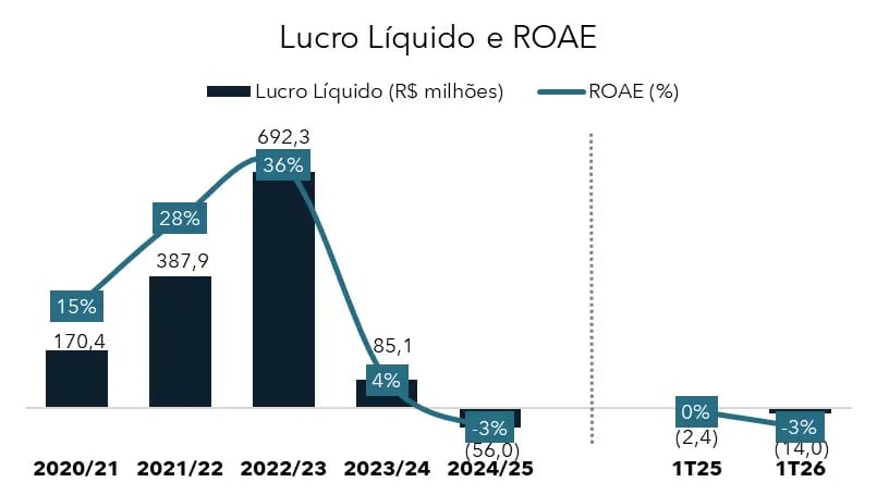Apesar do avanço da receita, a companhia registrou um prejuízo de R$ 14 milhões no 1T26, refletindo a menor produtividade do período e uma menor diluição dos custos fixos.