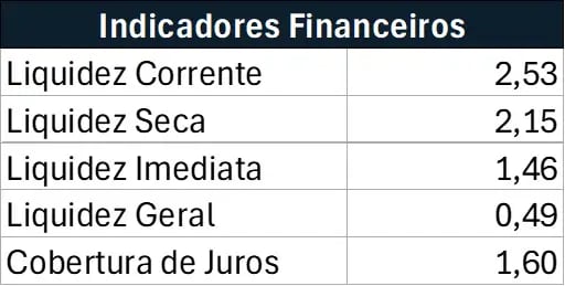 Os indicadores de liquidez e cobertura de juros encontram-se acima do mínimo adequado (1x), com exceção da liquidez geral. A emissão atual, em garantia firme, auxiliará esse indicador.