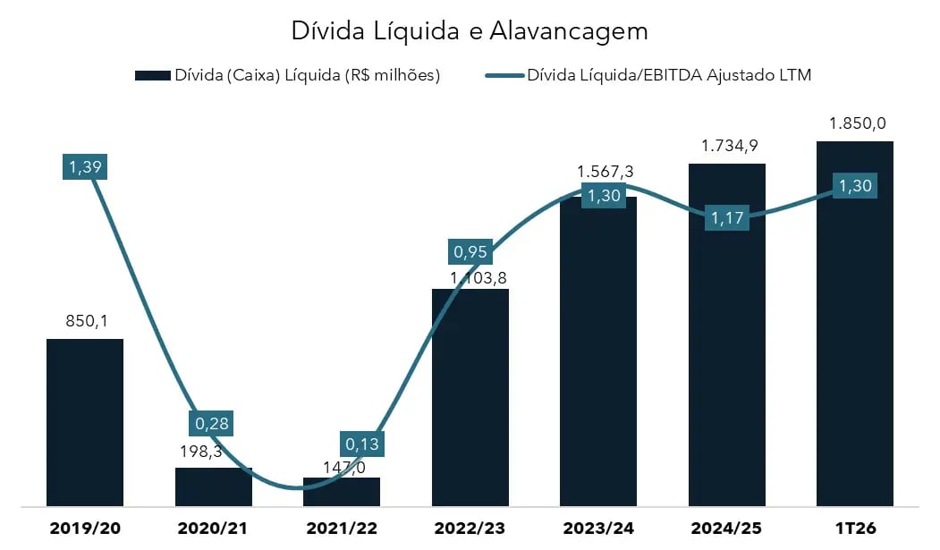 A dívida líquida foi elevada para R$ 1,85 bilhão (+6,6% vs. 1T25). Com isso, a alavancagem (razão entre a Dívida líquida e o Ebitda ajustado dos últimos 12 meses) passou de 1,17x para 1,30x. Apesar dessa elevação, a alavancagem permanece em um patamar confortável e distante do limite de 3,25x definido pelo covenant da emissão.