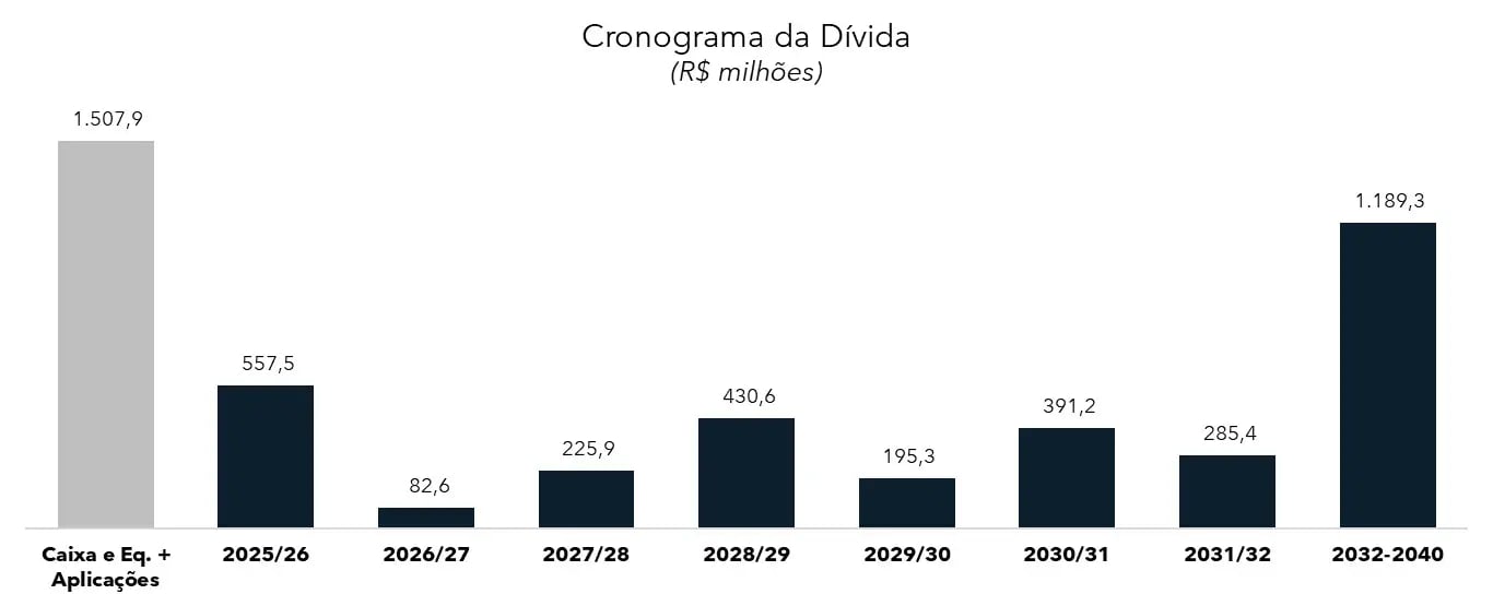 O consumo em investimentos, de R$ 135 milhões, reflete principalmente o plantio de cana e aquisição de imobilizado, enquanto o financiamento líquido de R$ 302 milhões decorre de novas captações superiores às amortizações. Como resultado, o caixa final atingiu R$ 1,5 bilhão, mantendo elevada liquidez.