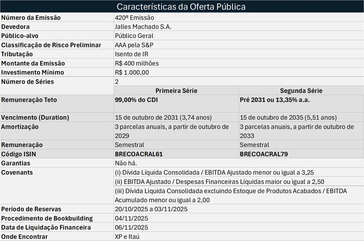 A primeira série possui taxa máxima de 99% do CDI a.a., a ser definida em bookbuilding, com vencimento em 15 de outubro de 2031 (duration: 3,74 anos).