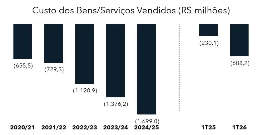 O custo das mercadorias vendidas apresentou um crescimento de 164%, atingindo R$ 608 milhões, impulsionado principalmente pelo início da produção de açúcar VHP na unidade de Santa Vitória, que não operava essa linha no período anterior, e pelo aumento dos custos de produção do etanol hidratado na USV.