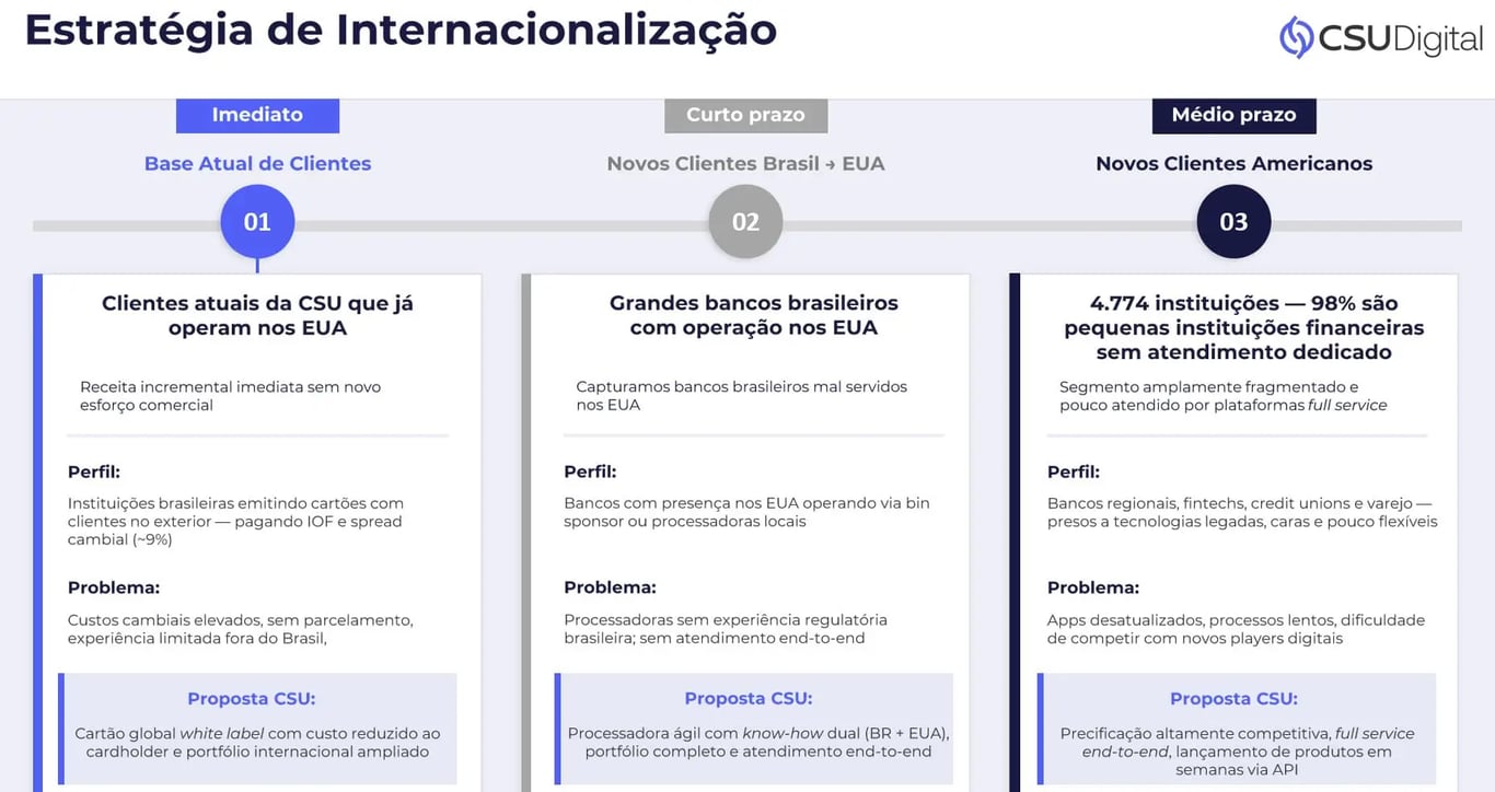 Neste primeiro momento, a CSU vai oferecer serviços de processamento de cartões emitidos nos EUA e gestão digital, com experiência diferenciada, como zero % de IOF, câmbio reduzido e parcelamento. Adicionalmente, a companhia vai oferecer suporte regulatório e de compliance para seus clientes (emissor).