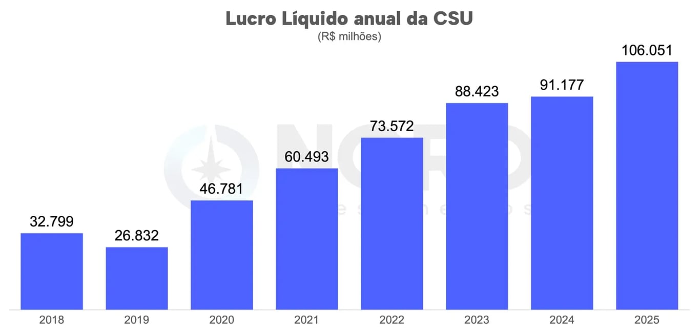 Diante dessa dinâmica, a CSU entregou, desde 2018, crescimento médio anual de cerca de 6% da receita, 13% do Ebitda e 18% do lucro líquido.