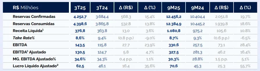Entre os destaques positivos do trimestre, chama atenção o forte crescimento das reservas confirmadas, que atingiram R$ 4,25 bilhões, alta de 15,4%. Esse desempenho foi impulsionado principalmente pelo segmento B2B no Brasil, que avançou 26,6% no período.