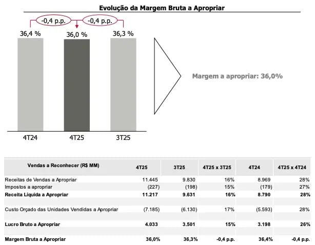 A incorporadora ainda aumentou suas receitas de vendas a apropriar em +28%, totalizando agora R$ 11,44 bilhões, com margem bruta a apropriar de 36% (-0,4 p.p.).
