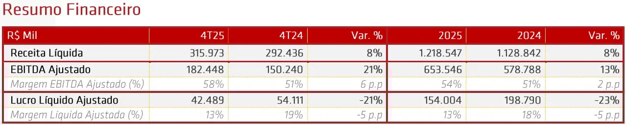 A Desktop (DESK3) registrou uma receita líquida de R$ 316 milhões no 4T25, alta de +8% na comparação anual. Já o Ebitda foi de R$ 182 milhões (+21%), enquanto o lucro líquido totalizou R$ 42 milhões, queda de -21% em relação ao 4T24.