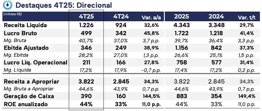 A Direcional (DIRR3) divulgou resultados robustos no quarto trimestre de 2025, em linha com as expectativas e reforçando a consistência operacional da companhia.