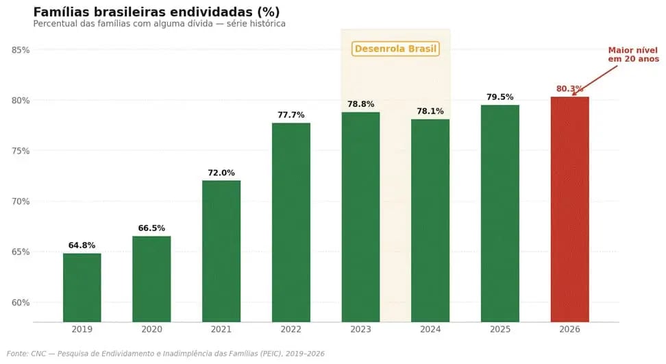Segundo levantamento da Confederação Nacional do Comércio (CNC), o endividamento das famílias brasileiras atingiu o maior nível em 20 anos em fevereiro de 2026. Quase 30% da renda familiar já está comprometida com dívidas e juros antes mesmo de a vida acontecer de verdade: antes da conta do mercado, da farmácia, da escola do filho.