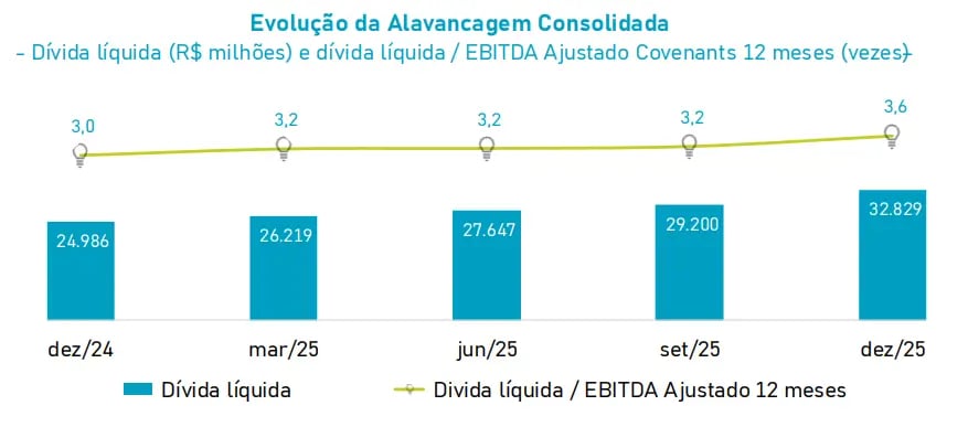 A companhia investiu um total de R$ 1,9 bilhão no 4T25, redução de -6% em relação ao mesmo período do ano anterior. Deste montante, aproximadamente 89% foi direcionado para o segmento de distribuição, que é o mais relevante para a sua receita.