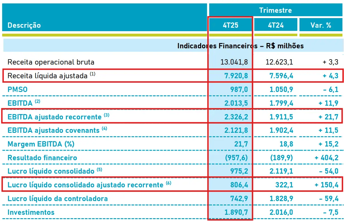 A Energisa (ENGI11) registrou uma receita líquida de R$ 7,9 bilhões no 4T25, alta de +4,3% em relação ao mesmo período do ano passado. Já o Ebitda totalizou R$ 2,3 bilhões, avançando +21,7%, enquanto o lucro líquido recorrente foi de R$ 806 milhões no trimestre (+150,4%).