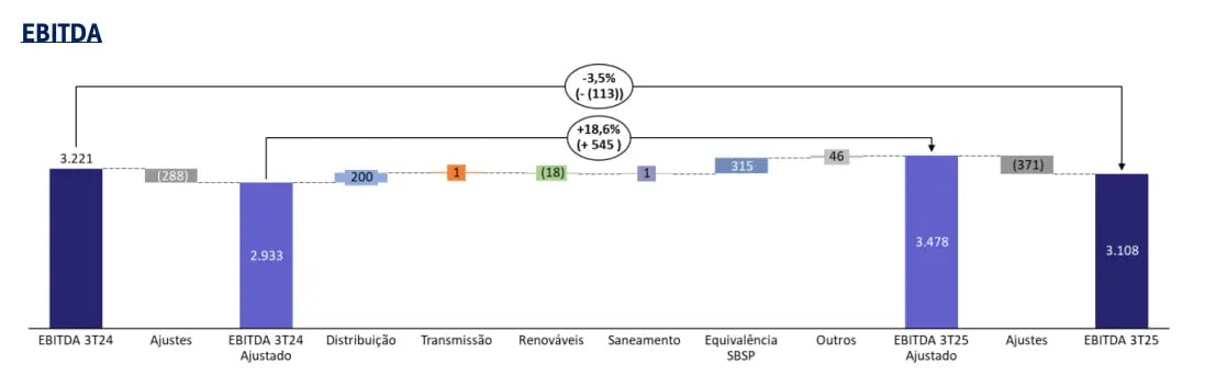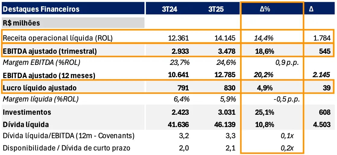 A companhia investiu um total de R$ 3 bilhões no 3T25, um aumento de +25%, sendo a maior parte dos recursos direcionada ao segmento de distribuição (mais relevante).