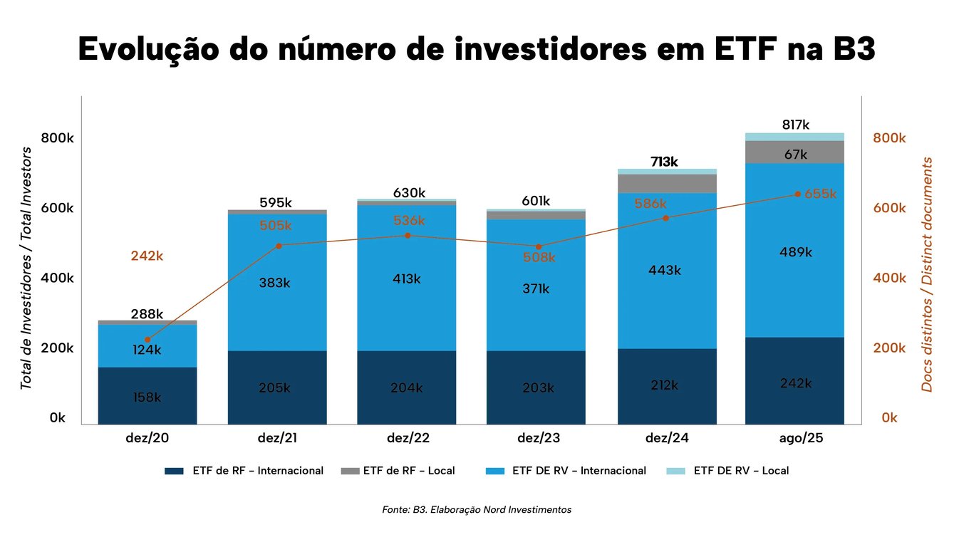 De acordo com o boletim da B3 de agosto de 2025, o número de investidores que investem em ETFs é de 817 mil pessoas, um crescimento de 14,6% em relação a dezembro de 2024 (713 mil).