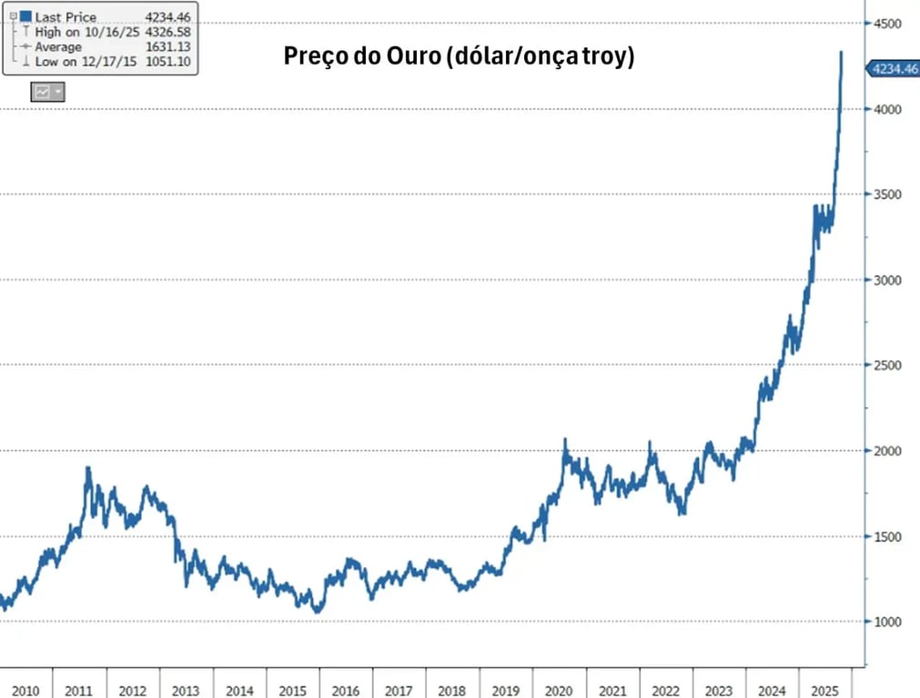 O ouro segue sendo o centro das atenções. Nesta semana, o metal ultrapassou os US$ 4.300 a onça.