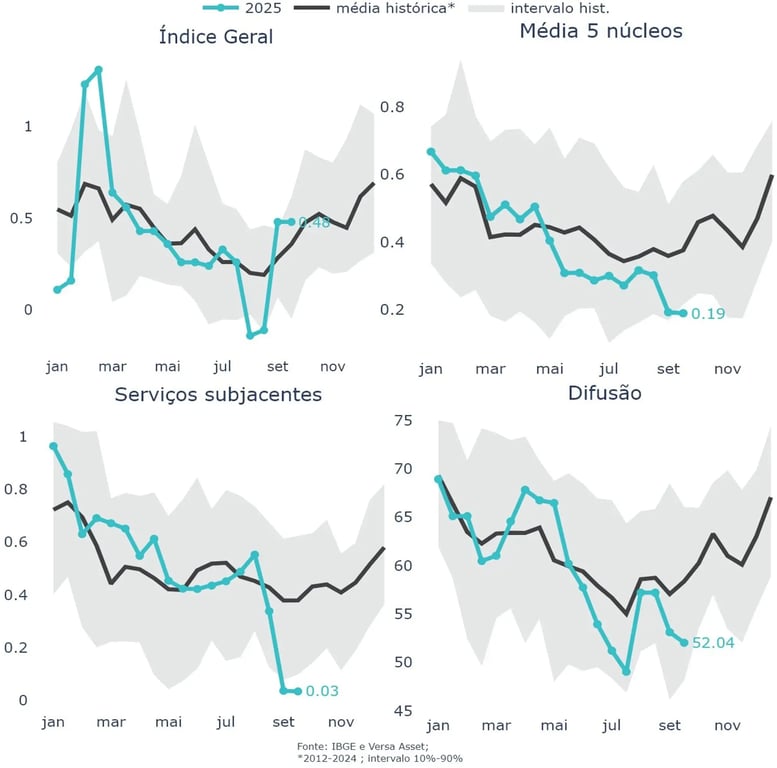 O IPCA de setembro apresentou uma alta de 0,48%, abaixo das expectativas do mercado, de 0,52%. Mais importante que o número cheio, os núcleos desaceleraram de 0,30% para 0,19% (comparado ao IPCA de agosto), e os serviços subjacentes passaram de 0,34% para apenas 0,03%.