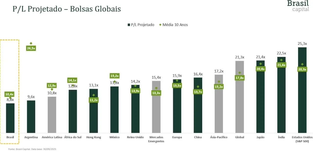 A Brasil Capital (fundo de ações) divulgou um gráfico interessante mostrando como está o múltiplo Preço/Lucro projetado das bolsas pelo mundo em relação à média dos últimos 10 anos.